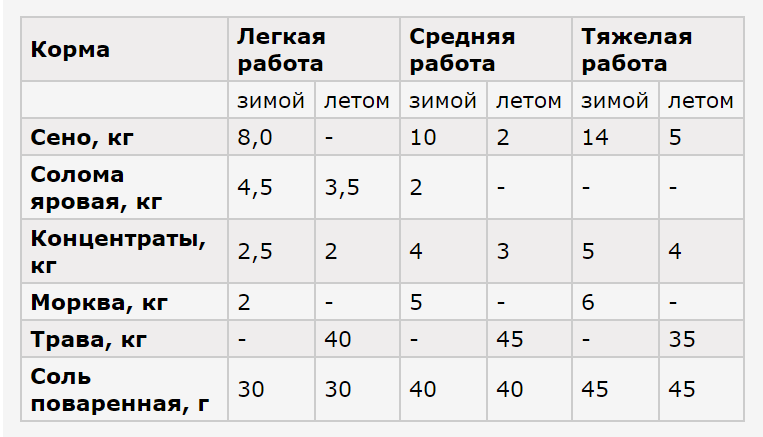 В-третьих, условия содержания и окружающей среды. Естественно, при работе в холодное время года, находясь в плохо приспособленном помещении, животное расходует дополнительную энергию на компенсацию больших теплопотерь, на поддержание постоянной температуры тела. Возрастает и потребность в дополнительных кормах. Примерным ориентиром при составлении рациона для вашей лошади с учетом собственных материальных возможностей могут служить рекомендации специалистов Института коневодства (см. таблицу).