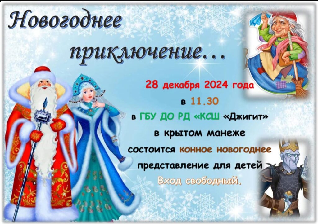 28 декабря 2024 года в 11.30 в ГБУ ДО РД «КСШ «Джигит» состоится конное новогоднее представление «Новогоднее приключение..»